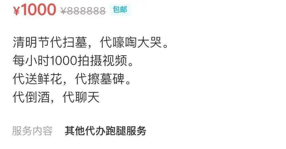 时至清明,网络上代祭扫服务悄然升温。记者在电商平台和二手交易市场发现,不少商家已经推出各类清明代祭扫服务,只需要提供委托人姓名及与已故人关系、已故人姓名、墓园具体位置、祭扫时间等即可开展清洁墓地、代烧纸钱、献花致敬、诵读祭文等服务,代祭扫的服务费在300-1000元不等。有商家透露,还可以根据客户要求提供定制的代祭扫服务,具体项目和收费明细由双方协商决定。